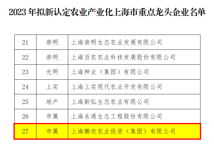 12月12日,上海市農(nóng)業(yè)農(nóng)村委員會(huì)公示了2023年農(nóng)業(yè)產(chǎn)業(yè)化上海市重點(diǎn)龍頭企業(yè)名單,鵬欣農(nóng)業(yè)投資集團(tuán)被認(rèn)定為農(nóng)業(yè)產(chǎn)業(yè)化上海市重點(diǎn)龍頭企業(yè)。